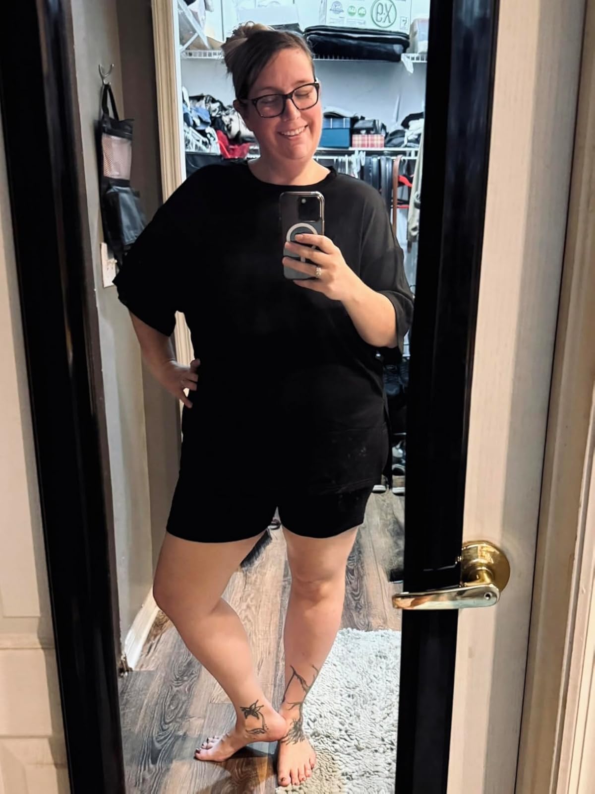 Super comfy set! I bought this to wear during the summer in my third trimester and it’s been perfect. I sized up one size from my pregnancy size to a medium because I wanted a more oversized look with the shirt and wanted to make sure the shorts would stretch over my 32 wk belly. They fit perfectly and haven’t shrunk after being washed multiple times. I do air dry them though and wash in cold water to prevent that.